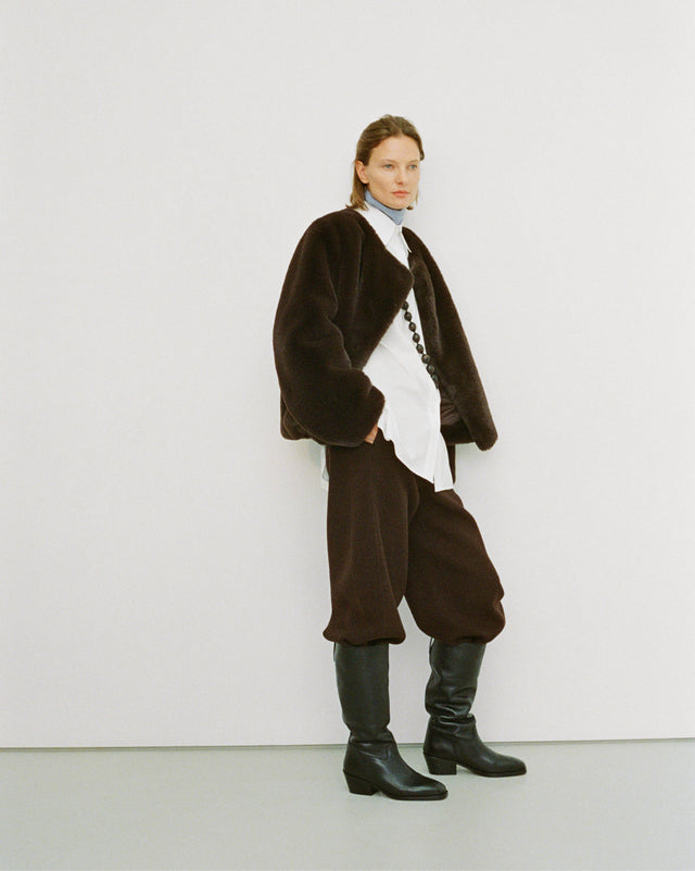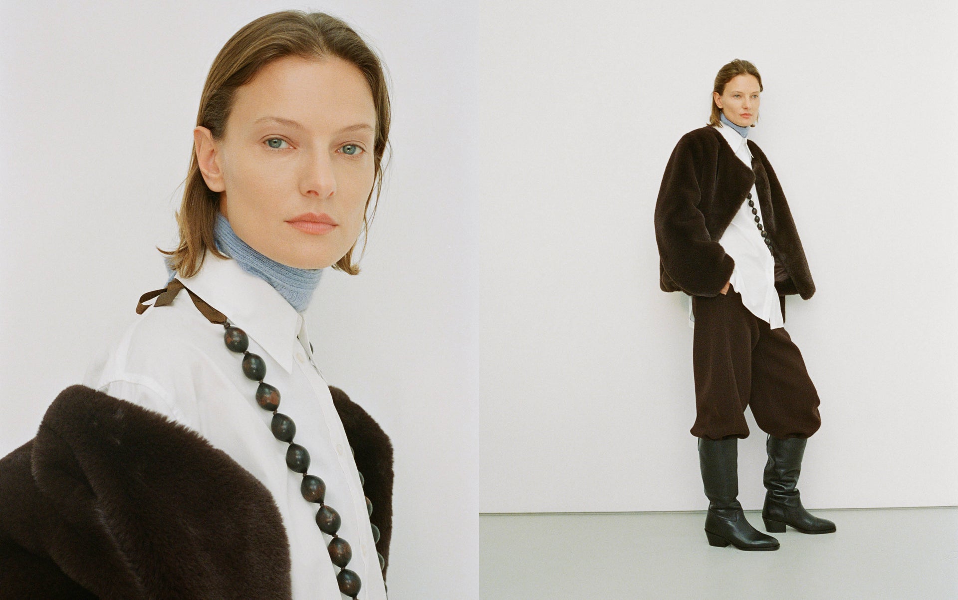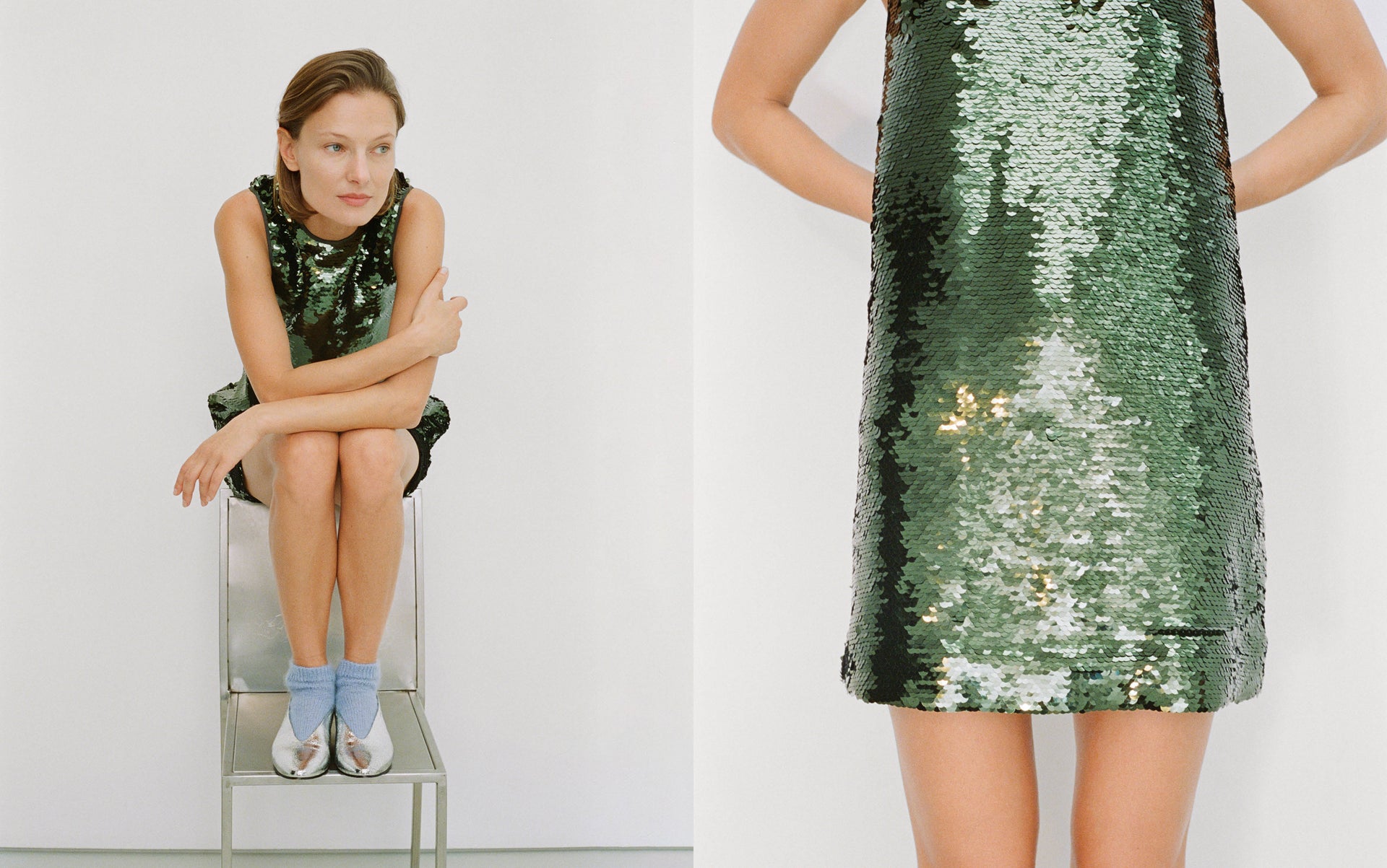 Un jersey marrón de doble cara de elegancia atemporal, un minivestido de lana y alpaca en color crudo o una falda de lentejuelas verde noche.