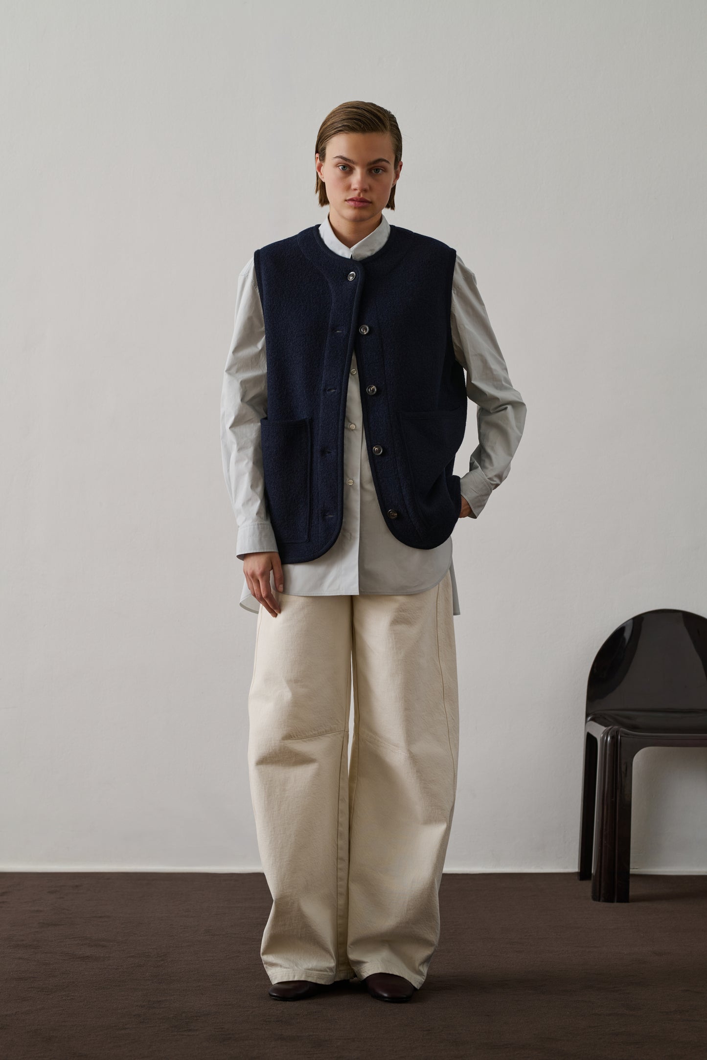 CHICAGO es una cazadora sin mangas de lana hervida. Esta lana cálida garantiza un aislamiento óptimo y es agradable al tacto. Está diseñado como un chaleco que se puede estilizar de infinitas maneras. Para llevar bajo un abrigo sin restringir el movimiento, o superpuesto a un simple jersey de punto.