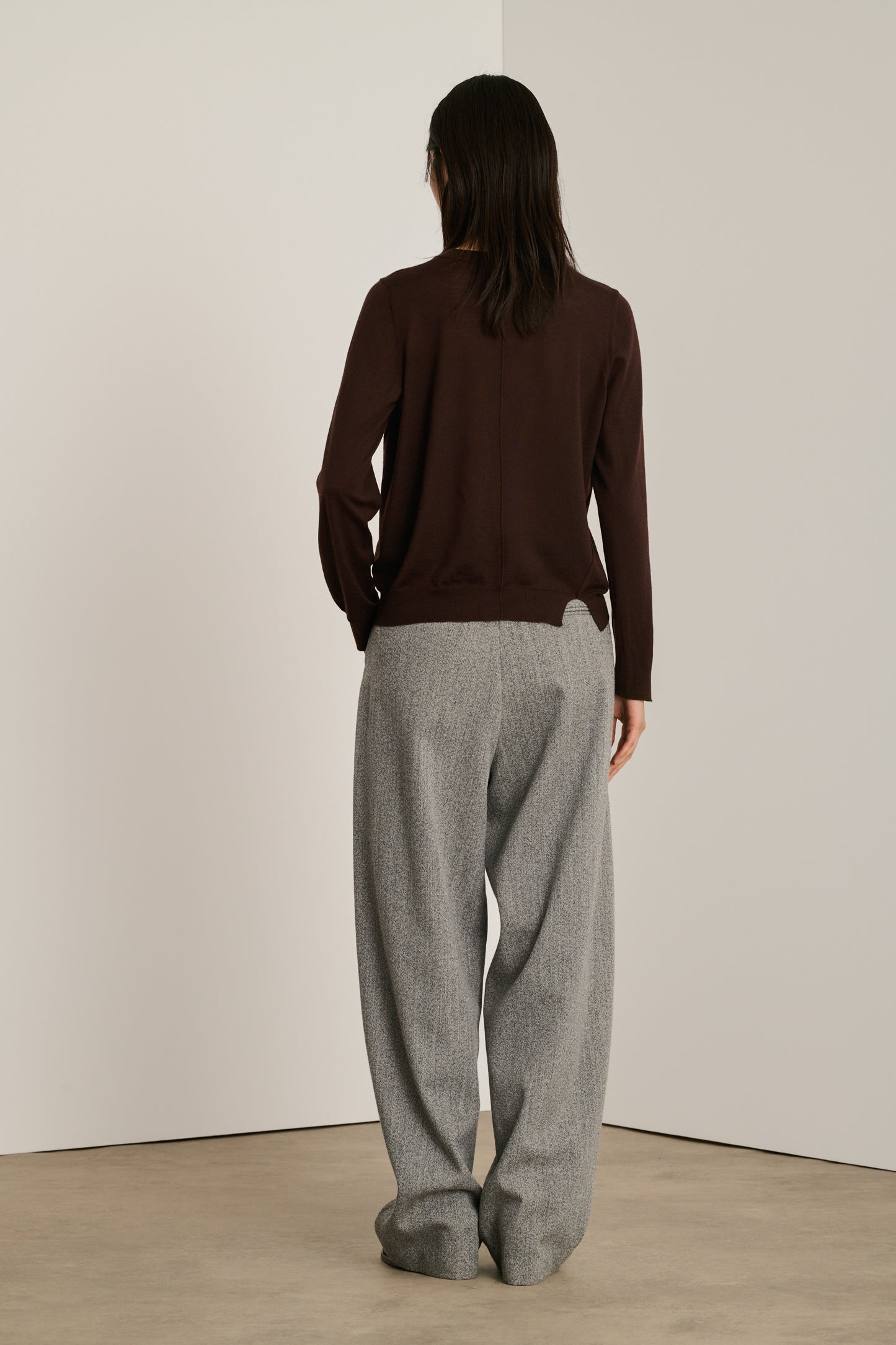 ALYSSA es un cárdigan holgado con un amplio escote en V. Está tejido en una lana merina extrafina para llevar directamente sobre la piel. La asimetría en la parte inferior del cuerpo, las disminuciones, los acabados de canalé y las costuras invertidas son detalles que enriquecen este cárdigan falsamente clásico.