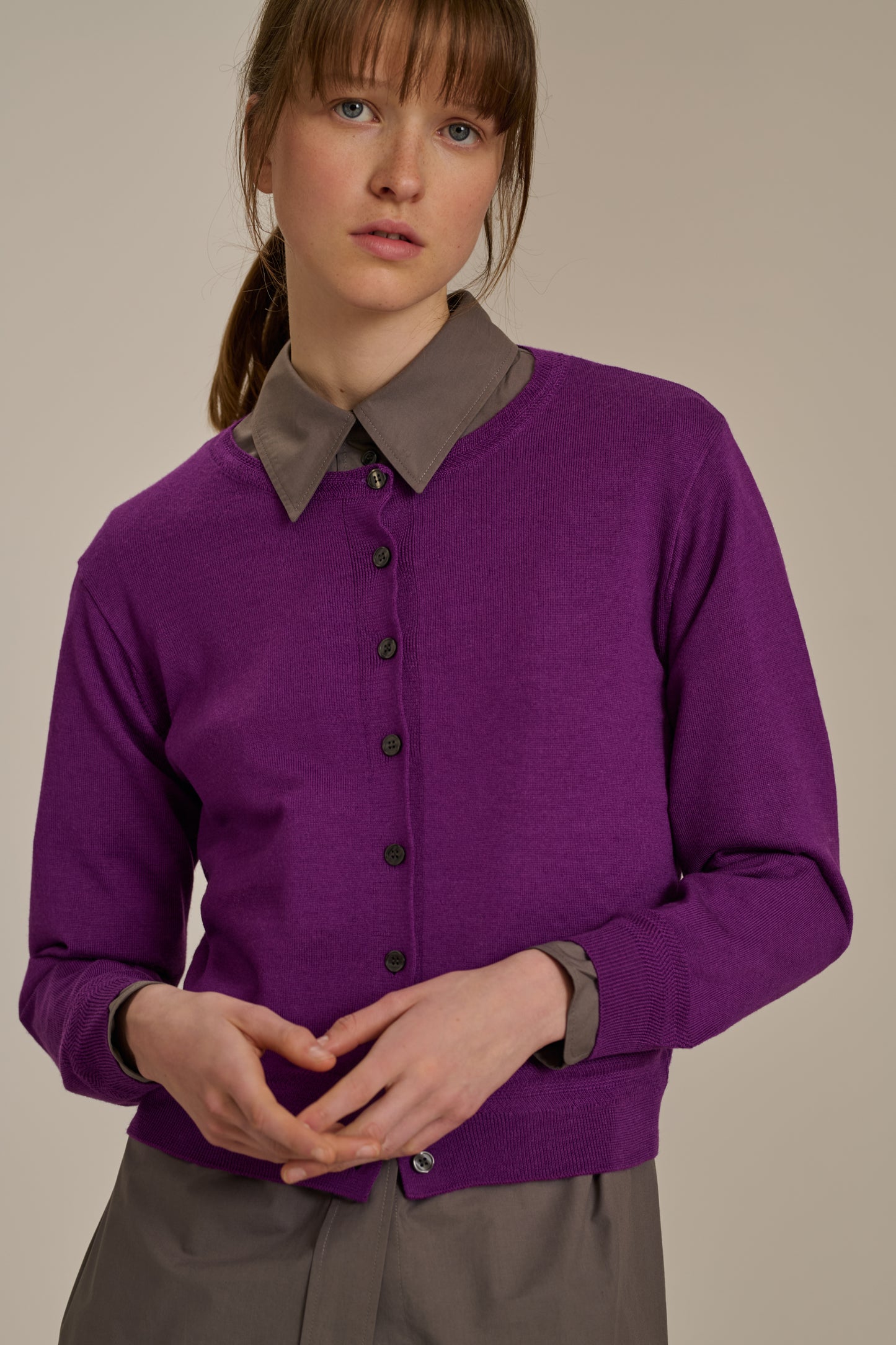 TITA es un cárdigan corto y cuadrado. Está tejido en una lana merino fina y suave para llevar directamente sobre la piel o en capas. Las mangas y la parte inferior del cuerpo están tejidas en un punto fantasía que le añade un toque de originalidad. Acompañará tanto a unos vaqueros de cintura alta como a una falda sencilla.