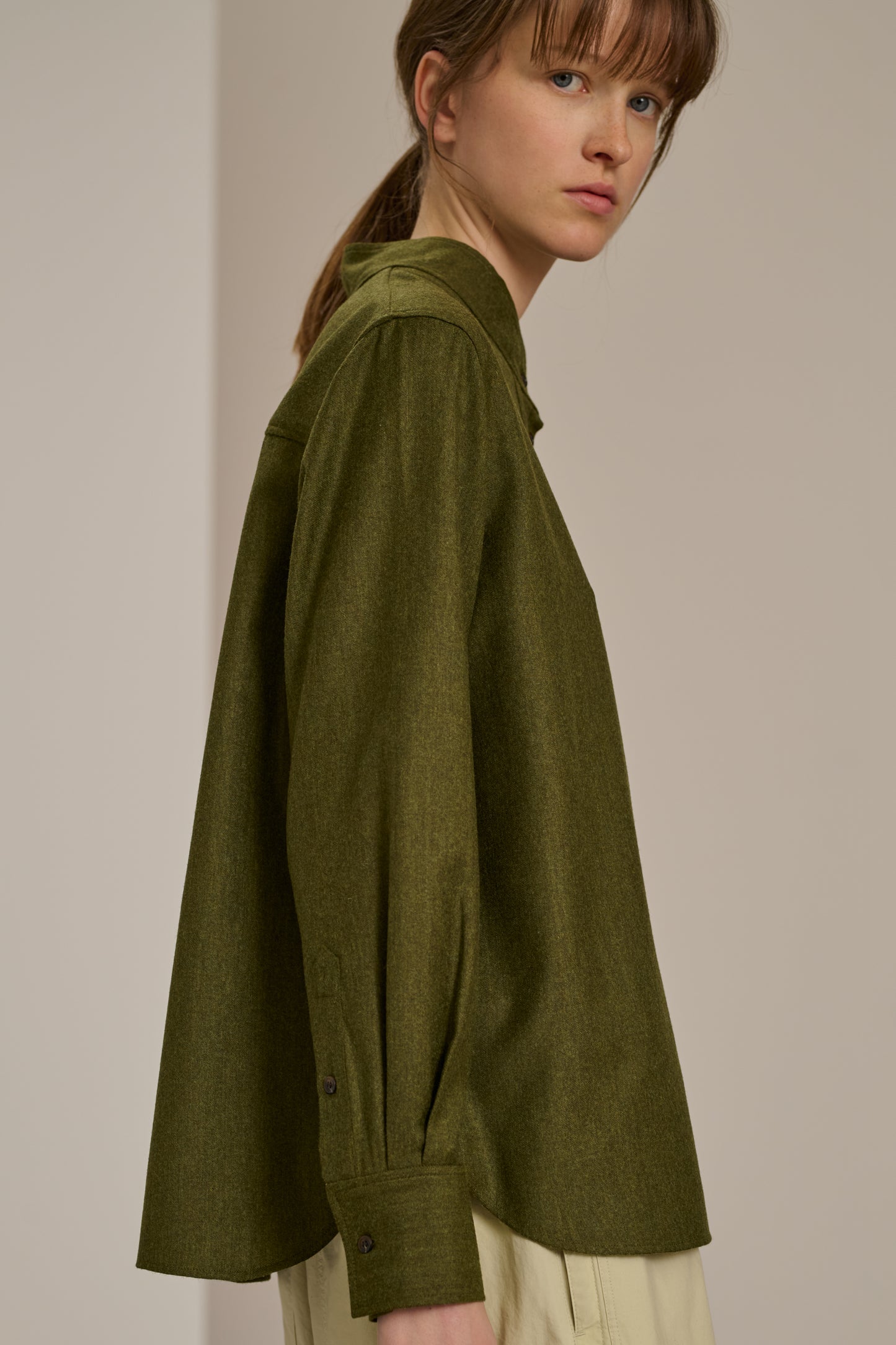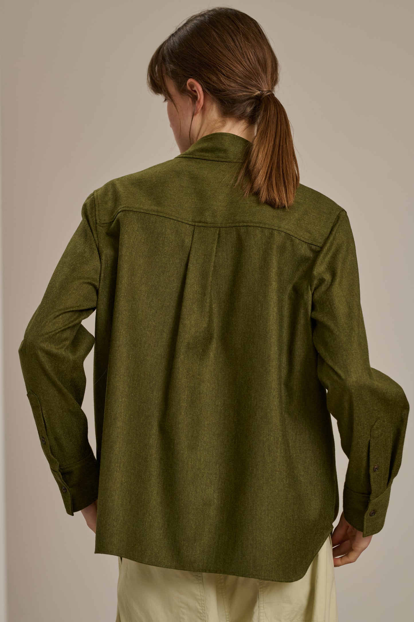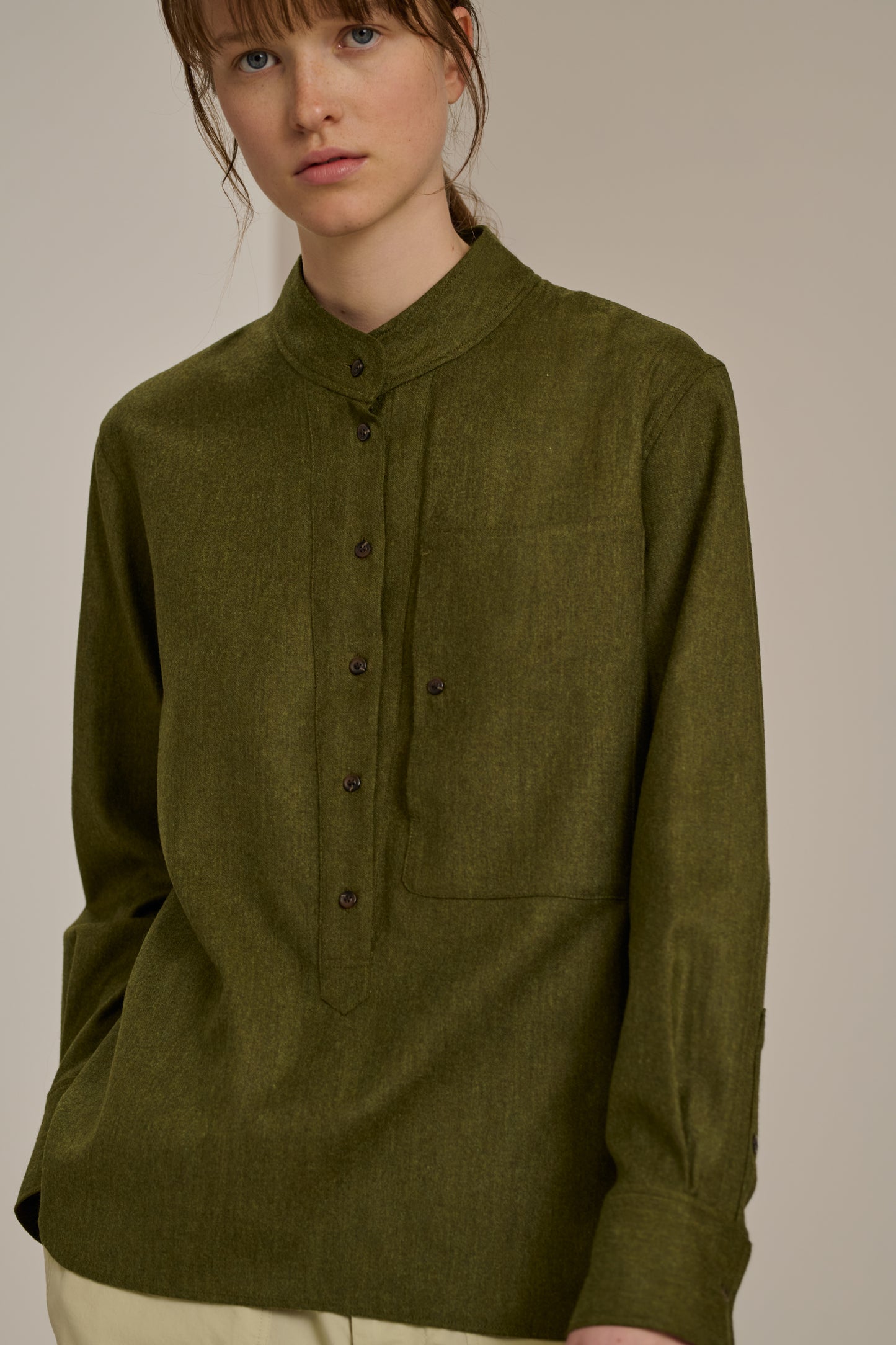 CROATIE es una blusa de franela jaspeada ligera. Su forma recta y amplia garantiza una silueta fluida y desenfadada, perfecta para un look que es a la vez chic y cómodo.