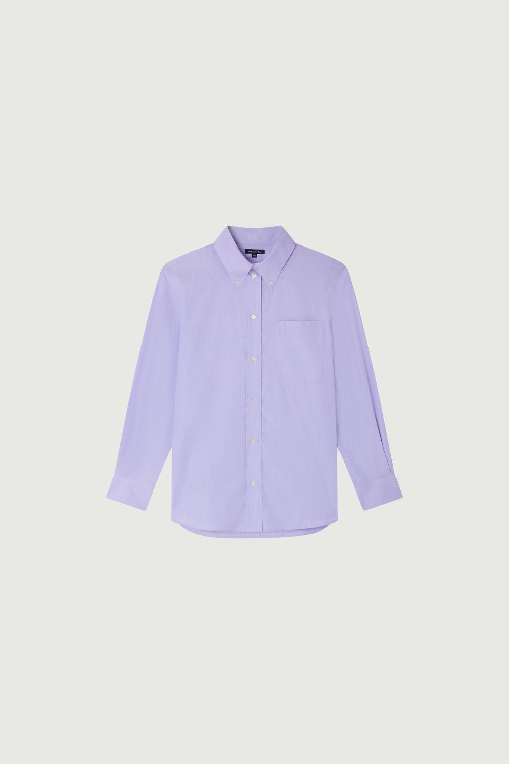 MARIA es una camisa de algodón fil a fil. Cuenta con un cuello de camisa de hombre, una abertura abotonada en la parte delantera, un bolsillo de parche en el pecho, y un bajo en forma de faldón para un toque moderno.