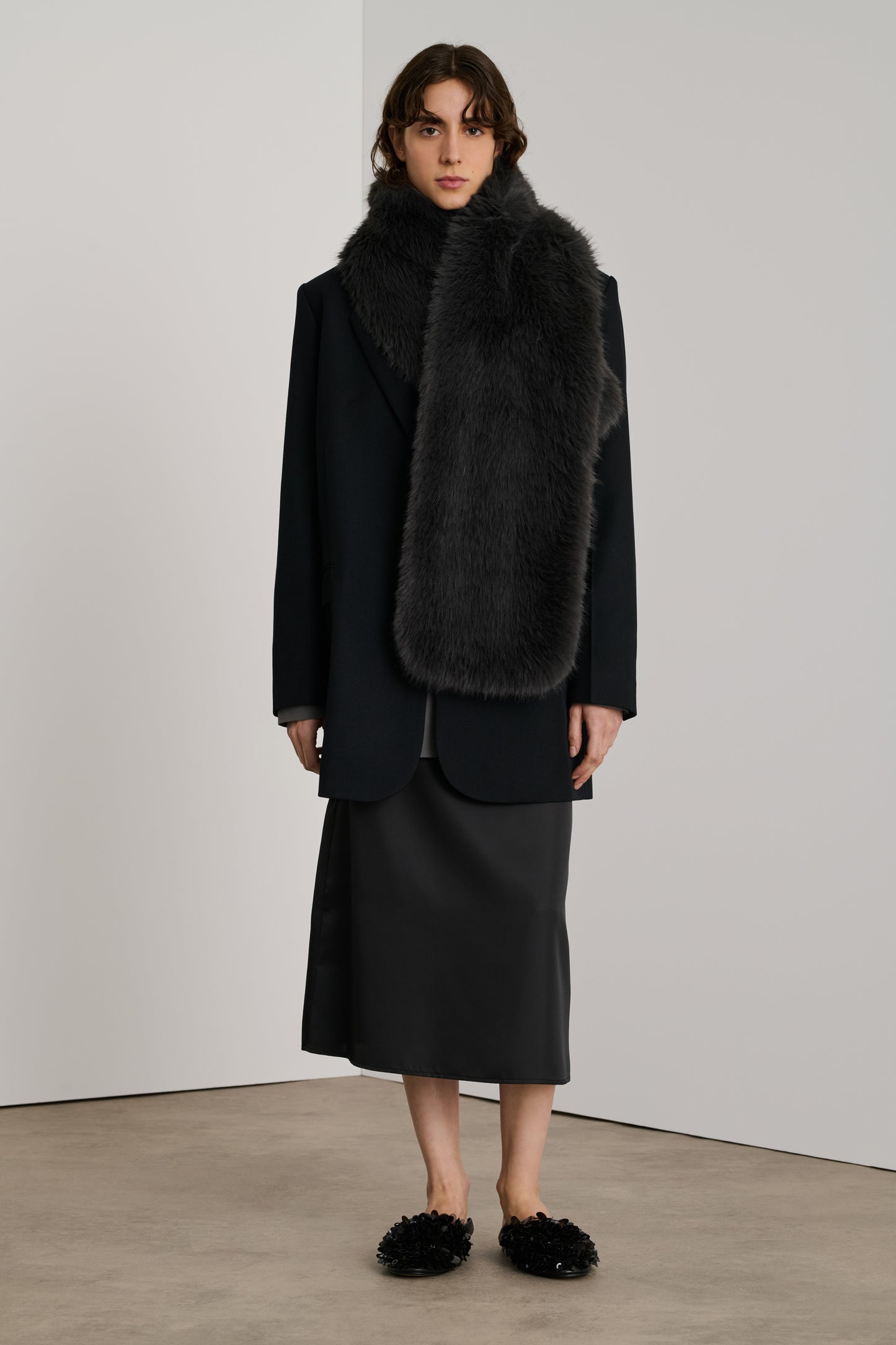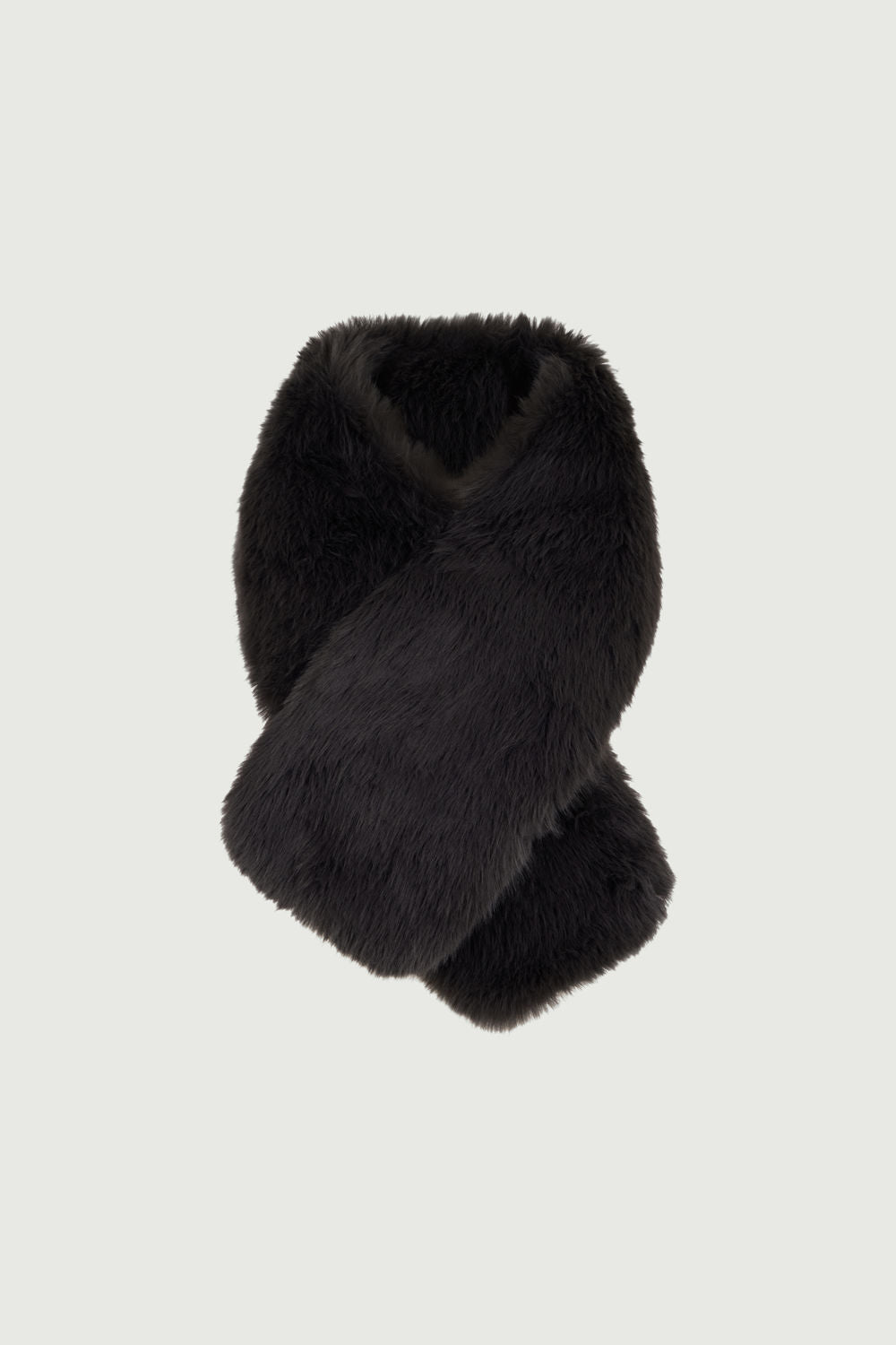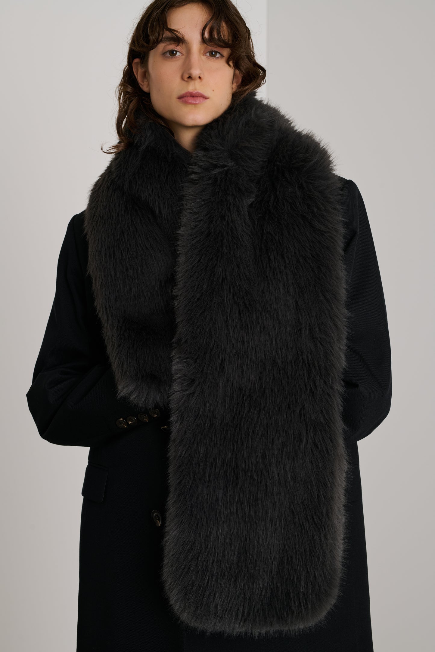 RUBY es una bufanda de piel sintética. De color antracita oscuro, con voluminoso pelaje, este cuello puede llevarse sobre una americana o una camisa para dar calidez a un conjunto invernal.