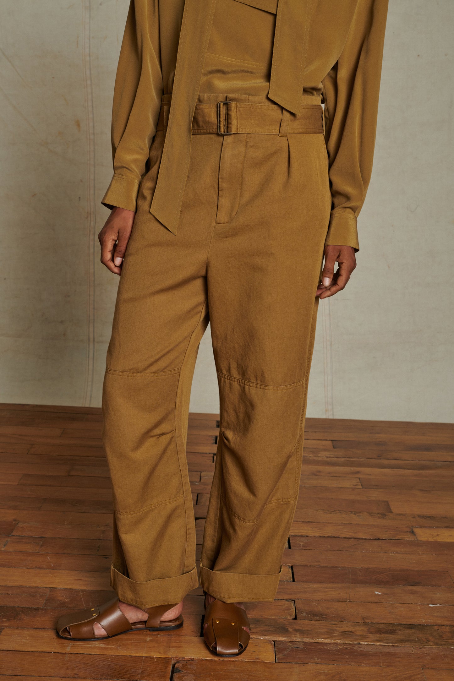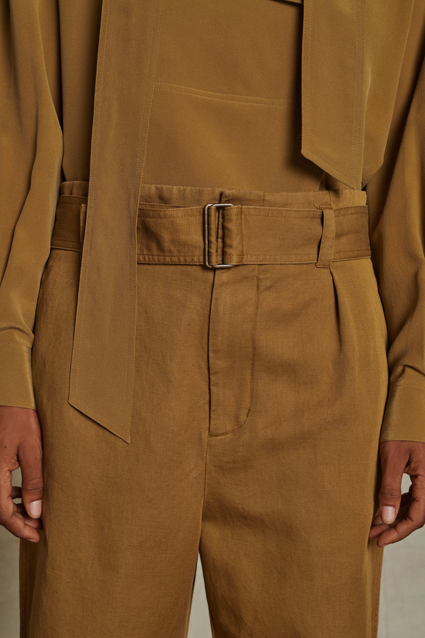 Pantalón cargo de tela de algodón y lino suave bronce