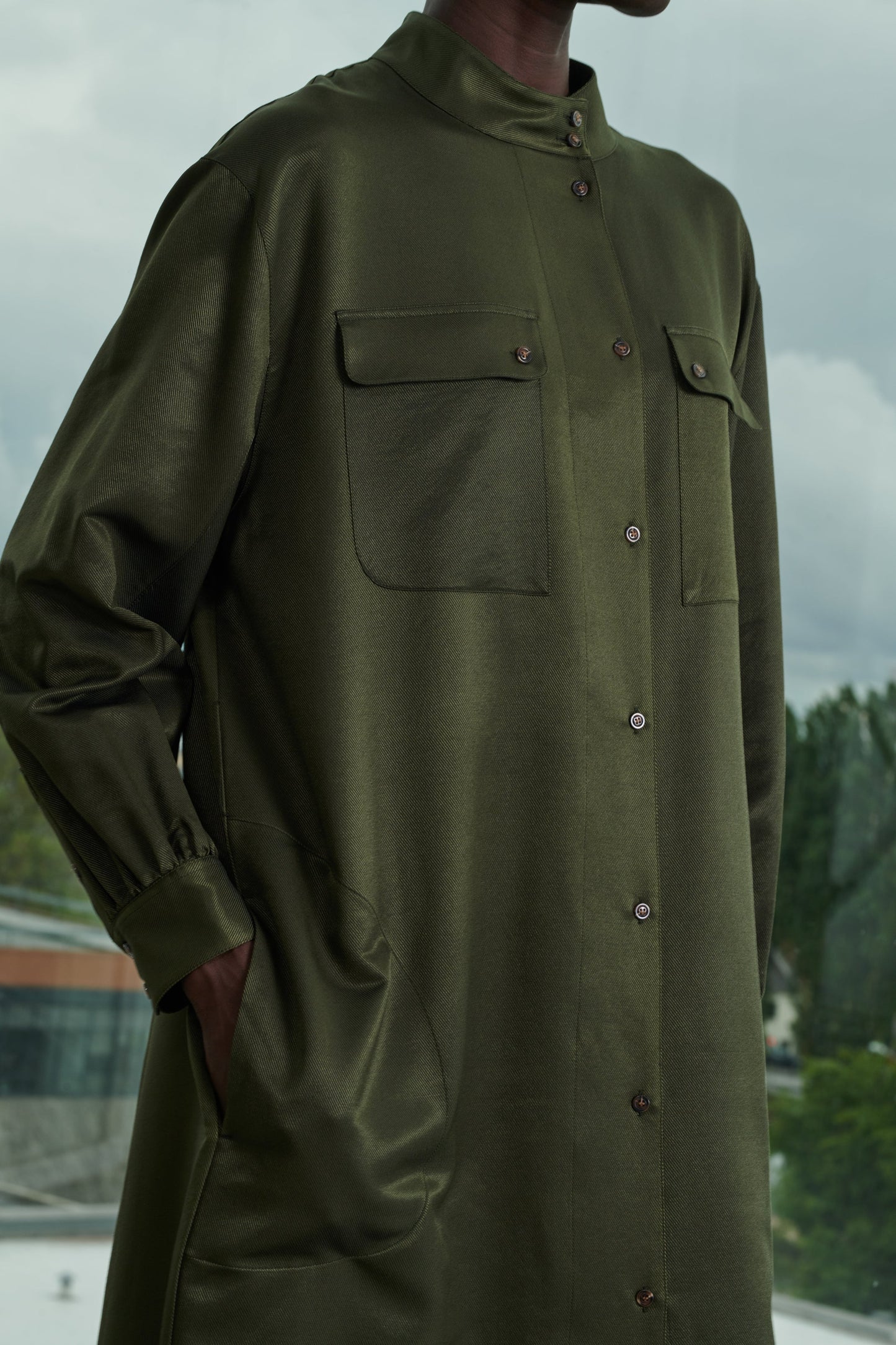 - Dos bolsillos en el pecho con abertura con botones