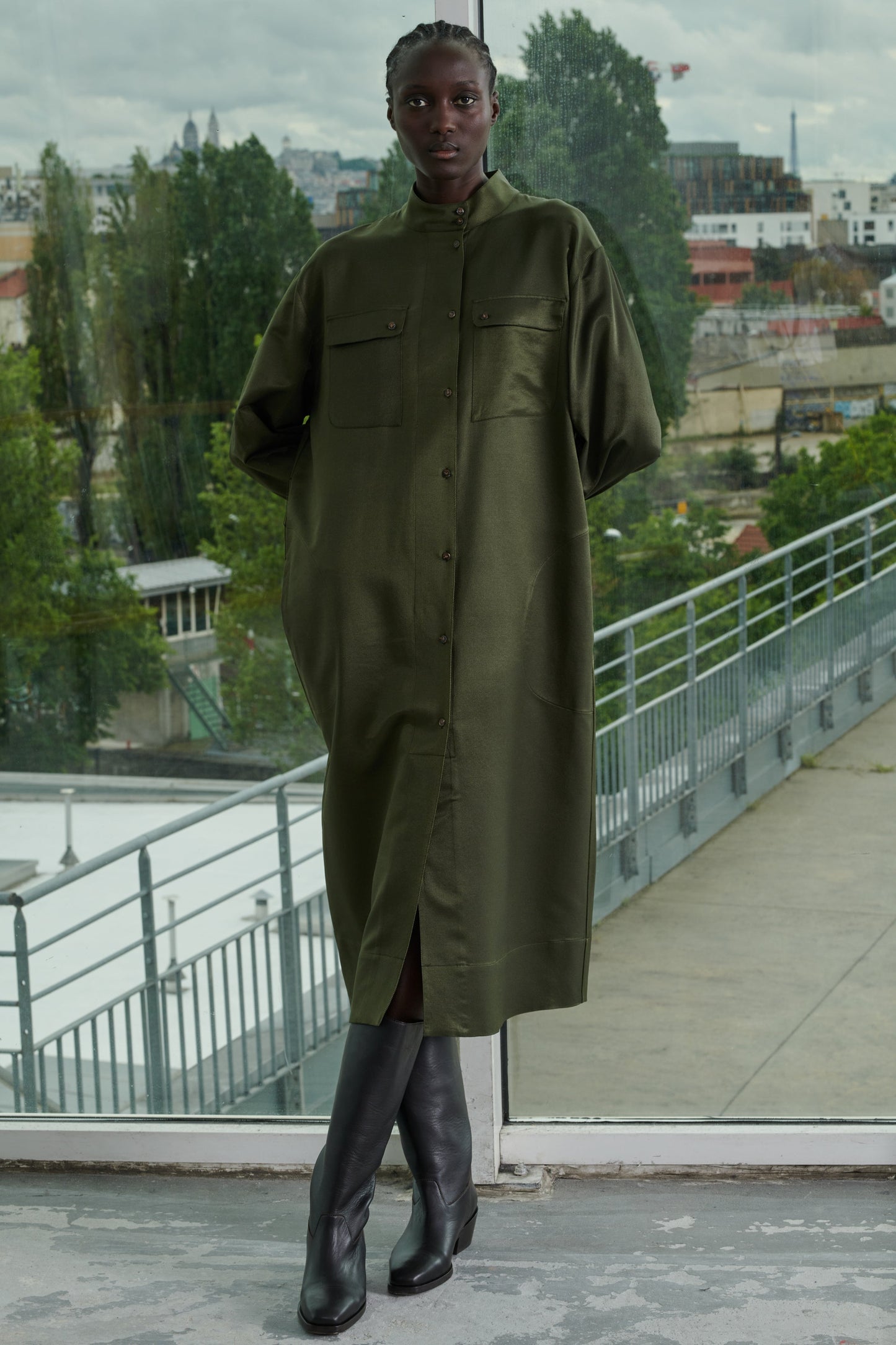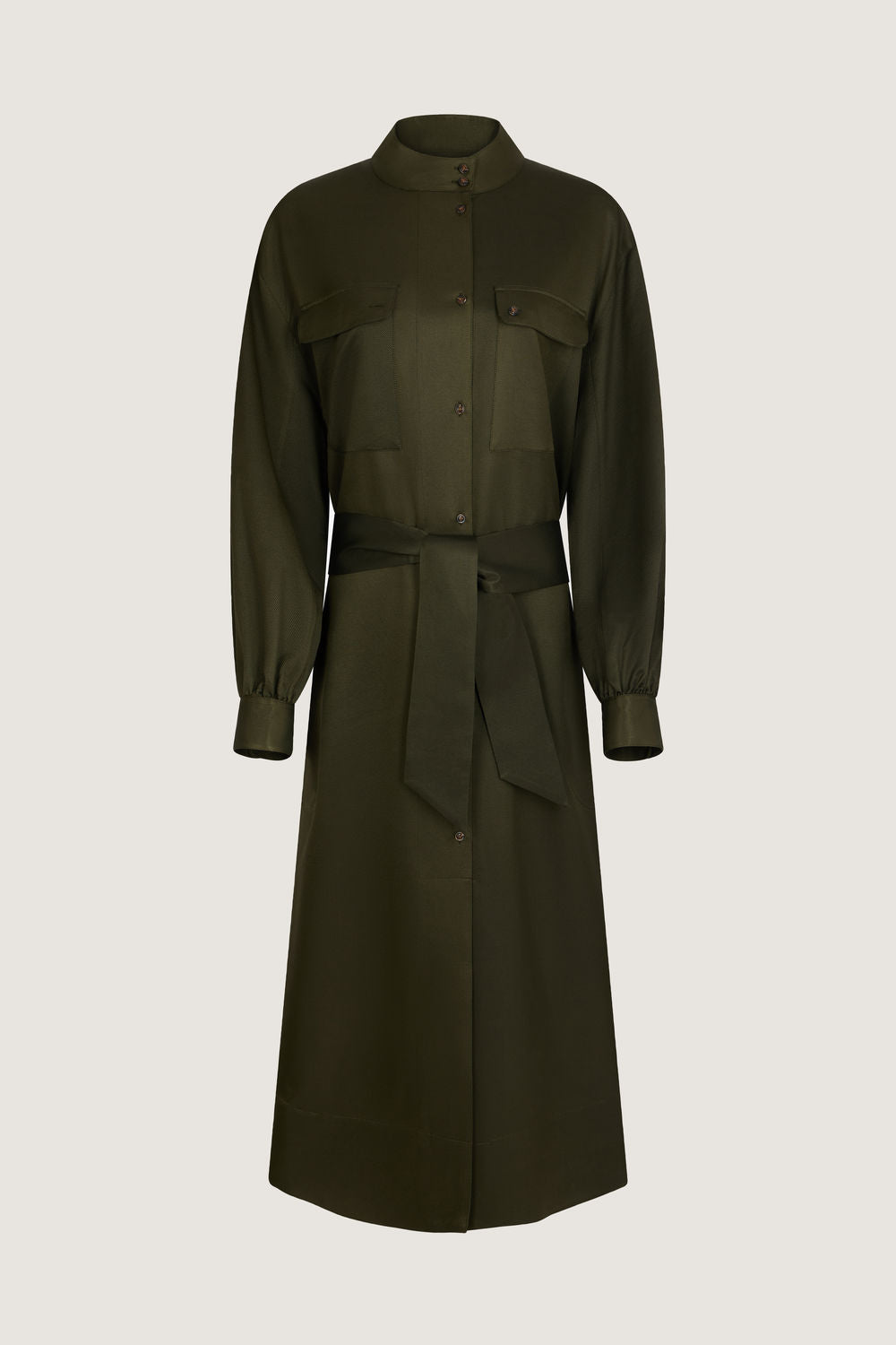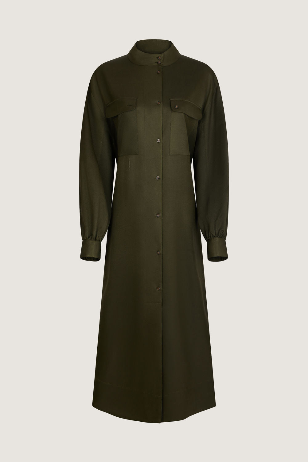 Vestido con cuello abotonado de sarga de seda estampada caqui