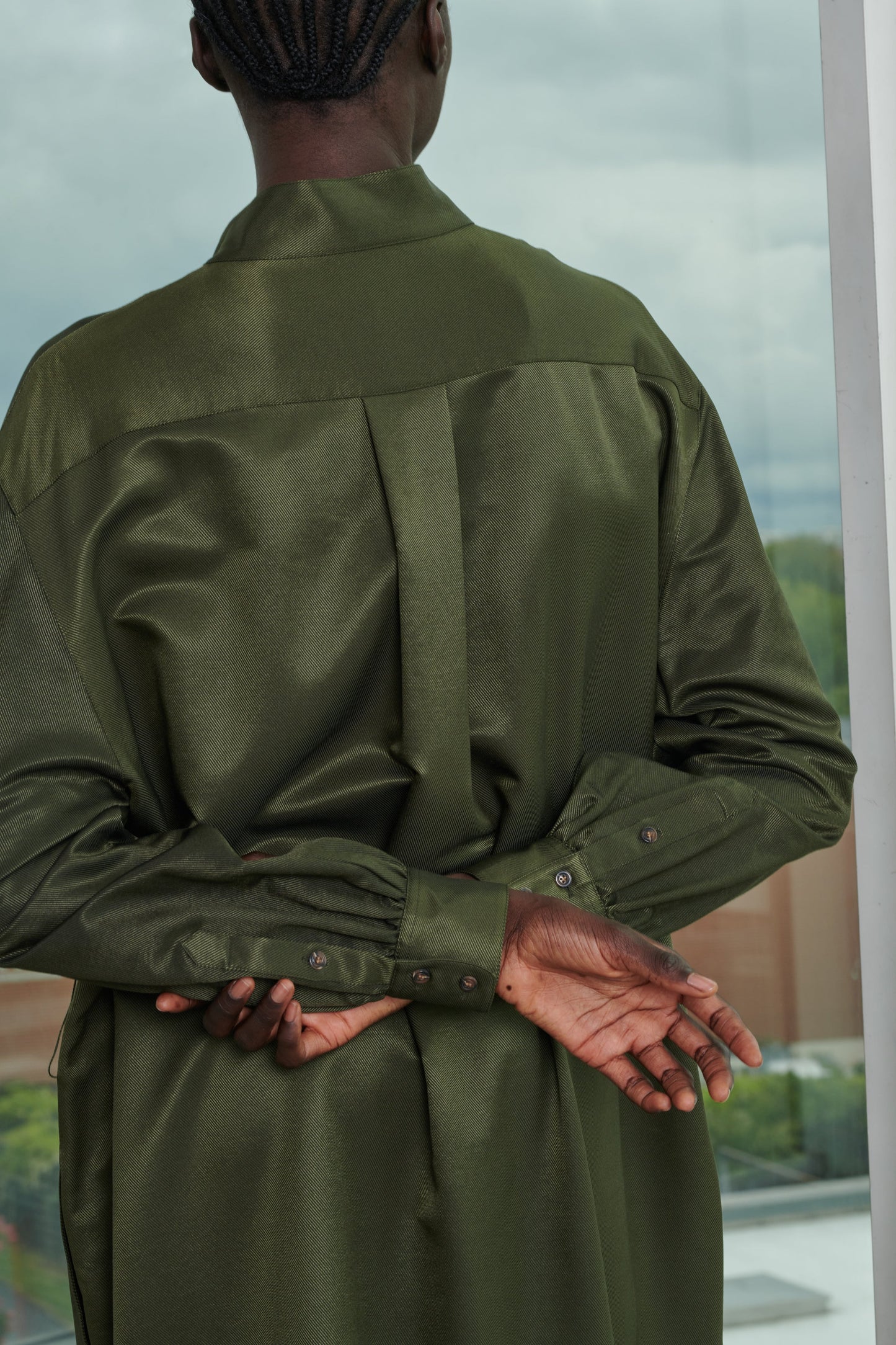 - Mangas largas y puños fruncidos